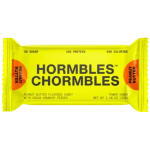 Hormbles Chormbles Peanut Butter Protein Candy Bars offer a creamy peanut butter flavor combined with crunchy cocoa bits for an indulgent snack experience. Each bar delivers 10 g of protein, 0 g of sugar, and 100 calories, making it a satisfying, guilt‑reduced treat that balances taste and nutrition.